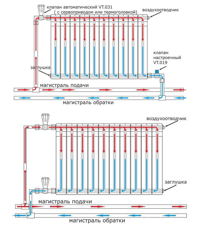 - Diagonale. In den meisten Fällen wird es beim Anschluss von Heizgeräten mit mehreren Abschnitten verwendet. Eine Besonderheit ist die Verbindung von Rohrleitungen. Der Vorlauf wird also auf der einen Seite des Heizkörpers mit der oberen Futorka verbunden und der Rücklauf auf der anderen Seite mit der unteren Futorka. Bei Reihenschaltung bewegt sich das Kühlmittel unter dem Druck des Heizsystems. Mayevsky-Kräne werden installiert, um Luft zu entfernen. Der Nachteil eines solchen Systems zeigt sich, wenn die Batterie repariert werden muss, da die Installation von Zentralheizungsbatterien auf diese Weise nicht die Möglichkeit mit sich bringt, die Batterien zu entfernen, ohne das System abzuschalten;