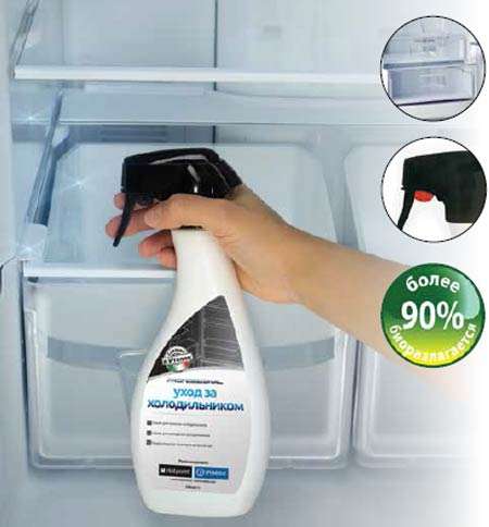 Es gibt drei Haupttypen von Haushaltschemikalien für den Kühlschrank: flüssig, Helium und pastös. Verwenden Sie keine säurehaltigen Scheuermittel. Auf diese Weise können Sie die Kunststoffwände des Kühlschranks beschädigen.