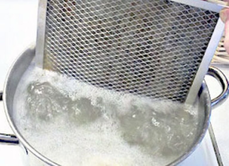 Wenn diese Methode keine Ergebnisse liefert, bleibt nichts anderes übrig, als das Haubengitter durch Kochen zu reinigen. Dazu wird Wasser in einen großen Topf gegossen, in das ein halbes Stück Waschmittel und ein paar Esslöffel Natron gegeben, angezündet und zum Kochen gebracht werden. Ein Filter wird in kochendes Wasser gestellt und 5-10 Minuten gekocht. Danach muss der Filter mehrere Stunden im Behälter mit der Lösung belassen werden.