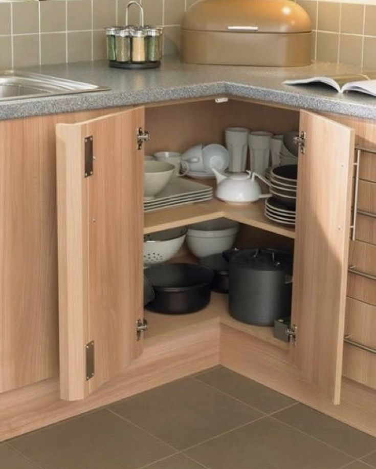 Ecke der Küche könnte sein gerade sowie abgeschrägt. Die letztere Option ist in geräumigen Räumen vorzuziehen, da sie mehr Platz "frisst".