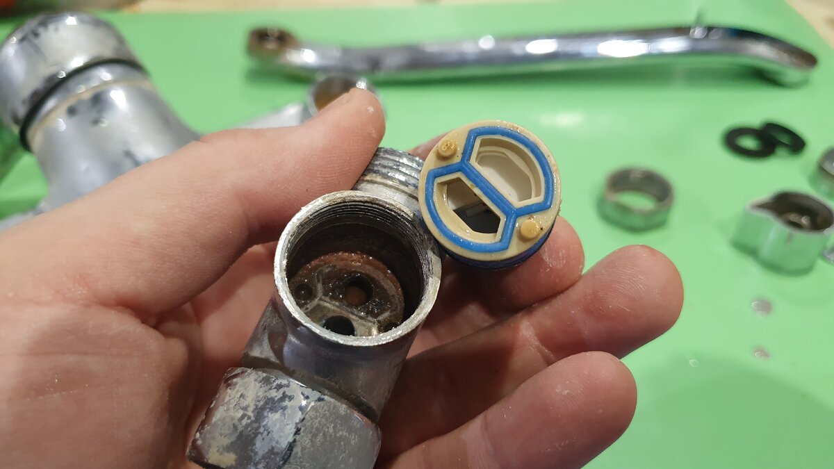 Dadurch wird der Zugang zur Mischerscheibe geöffnet. Sie können es bekommen und eine neue Patrone in den entstandenen Raum einsetzen, während Sie die korrekte Position der Löcher an diesem Teil überwachen müssen.