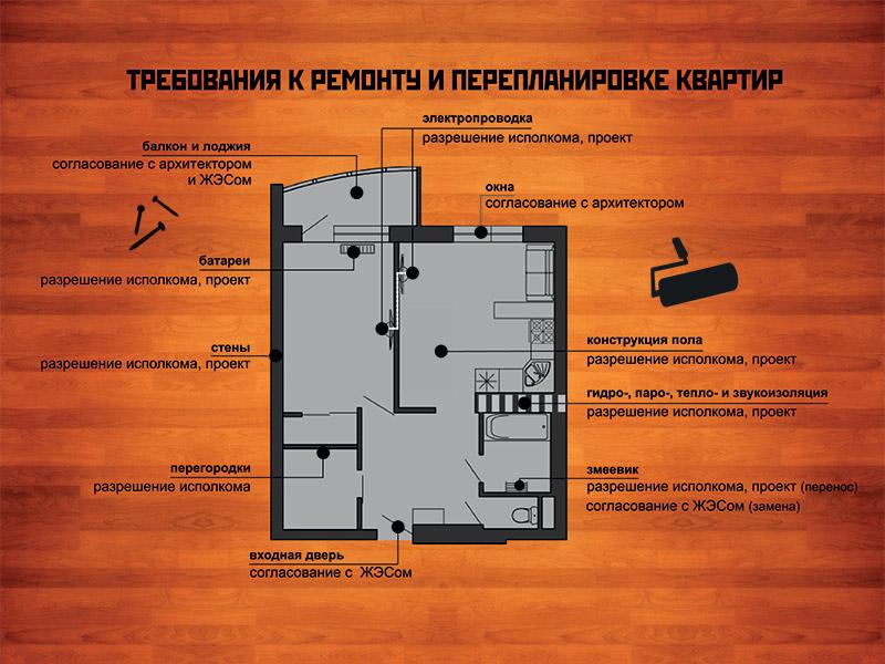 Informieren Sie sich vor der Sanierung, welche Arbeiten erlaubt und welche strengstens verboten sind. Das Verfahren zur Koordinierung der geplanten Reparaturmaßnahmen liegt in der Verantwortung des Eigentümers. Alle für seine Beauftragung erforderlichen Kosten trägt er. Der Registrierungsprozess erfolgt in mehreren Phasen: Entwicklung eines Projekts (Skizze), Sammlung von Dokumenten, Einholung der Genehmigung. Nach Abschluss der Reparaturarbeiten unterzeichnet er eine Abnahmevereinbarung. Alle Immobiliendokumente werden neu registriert.