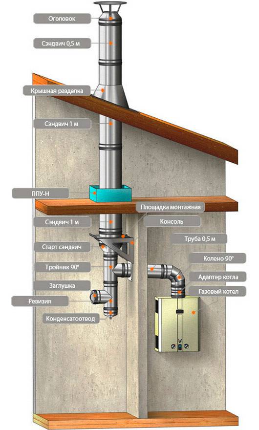 Eine Besonderheit von Gaskesseln ist ihre hohe Effizienz. Daher ist die Temperatur der austretenden Gase niedrig, Kondensat bildet sich schnell und das System muss unter Berücksichtigung der Verringerung der schädlichen Auswirkungen von Kondensat auf die Rohrwände installiert werden.