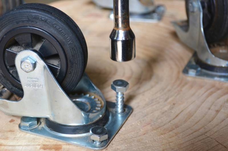 Wir verteilen die Räder und alle Schrauben. Danach fixieren wir jeden von ihnen mit einem Schraubenschlüssel.