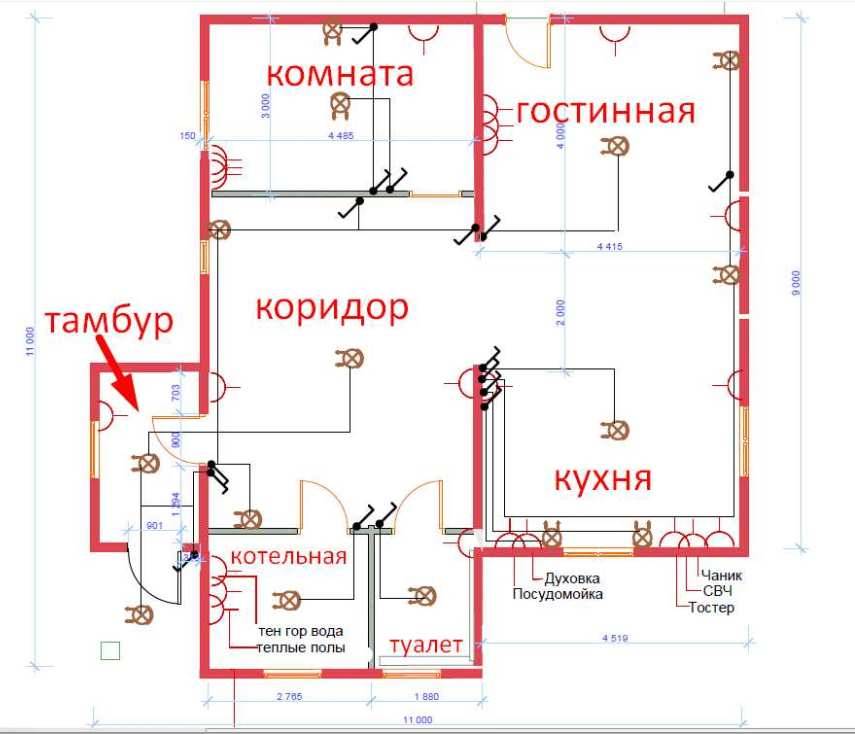 Die angegebenen Schritt-für-Schritt-Anleitungen sind Standard und hängen nicht vom Material der Wände und den individuellen Eigenschaften des zu erstellenden Schaltplans in einem Privathaus ab. Für Holzhäuser gibt es jedoch einige Nuancen: