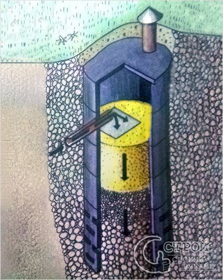 An der Unterseite des Bauwerks wird eine Filterschicht aus Schotter oder Kies bis zu einer Höhe von einem Meter verfüllt. In diesem Fall werden große Teile des Materials unten und kleine oben platziert. Das Loch für das Rohr, durch das die Abwässer aus der Klärgrube fließen, ist so ausgeführt, dass Wasser aus einer Höhe von 40-60 cm in einem Strahl fließt.