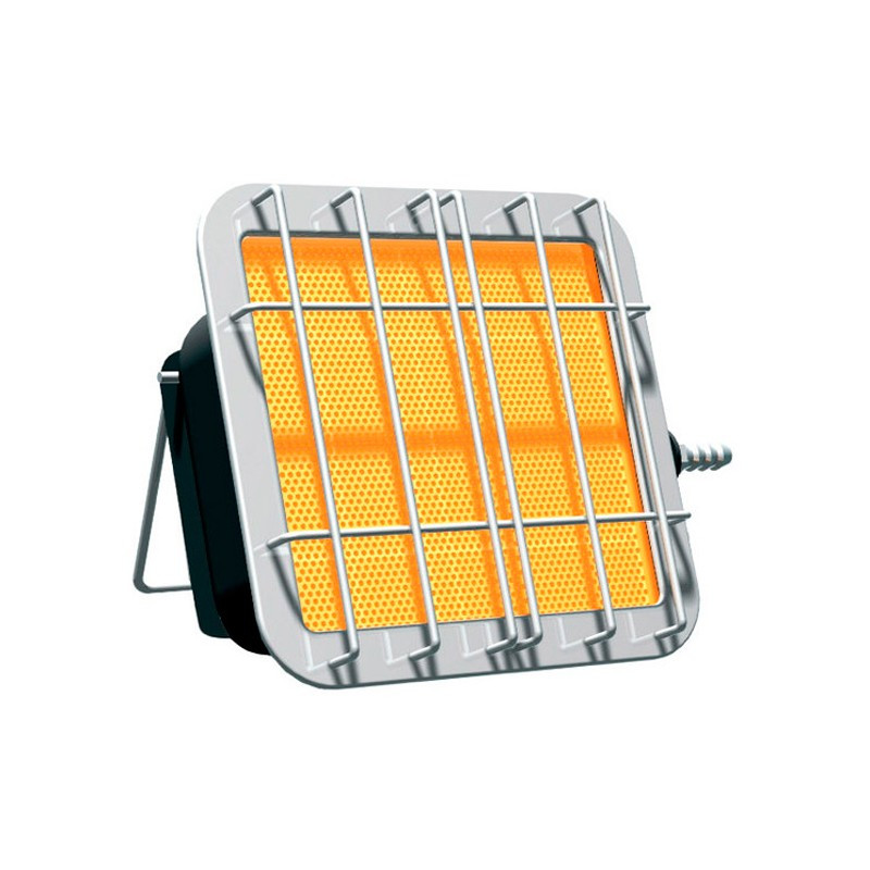 Die zweite Art von Zeltheizungen ist mit einem Emitter einer Metallstruktur ausgestattet. Die Stahlstangen des Arbeitsgeräts befinden sich in einer geschützten Position, sodass diese Art von Gerät, wie Keramik, sicher ist. Der Vorteil dieses Geräts ist die Möglichkeit, die Richtung des Wärmestroms einzustellen.Für große Zelte werden Geräte aus Metall verwendet, da mit ihnen eine große Fläche beheizt werden kann. Trotzdem hat eine Gasheizung aus Metall in einem Zelt einen noch geringeren Wirkungsgrad von 30 %.