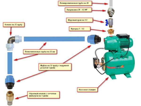 Die wichtigsten Komponenten des Wasserversorgungssystems mit einer Pumpstation sind also die folgenden: