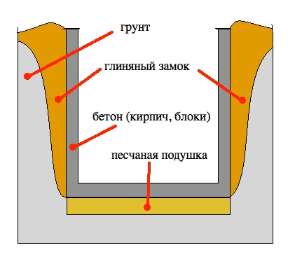 In einer bis zu 2 m tiefen Grube wird entlang der Abdichtungsschicht ein 20-25 cm dickes Kissen aus Sand und Schotter verlegt. Entlang der Wände wird eine Schalung zum Betonieren angeordnet, zuvor werden dort Abdichtungen und Bewehrungen in Form von geschweißten Rahmen oder Maschen angebracht. Nachdem der Beton gegossen wurde, wird die Schalung entfernt, die Böden werden entlang des Bewehrungsnetzes betoniert. Zuerst wird eine Betonschicht gegossen und das Netz verlegt. Wenn die erste Schicht aushärtet, können Sie die zweite gießen. Nachdem der Beton ausgehärtet ist, werden die Wände und Böden mit einer Schicht flüssiger Abdichtung bedeckt. Sie können das Dachmaterial kleben.