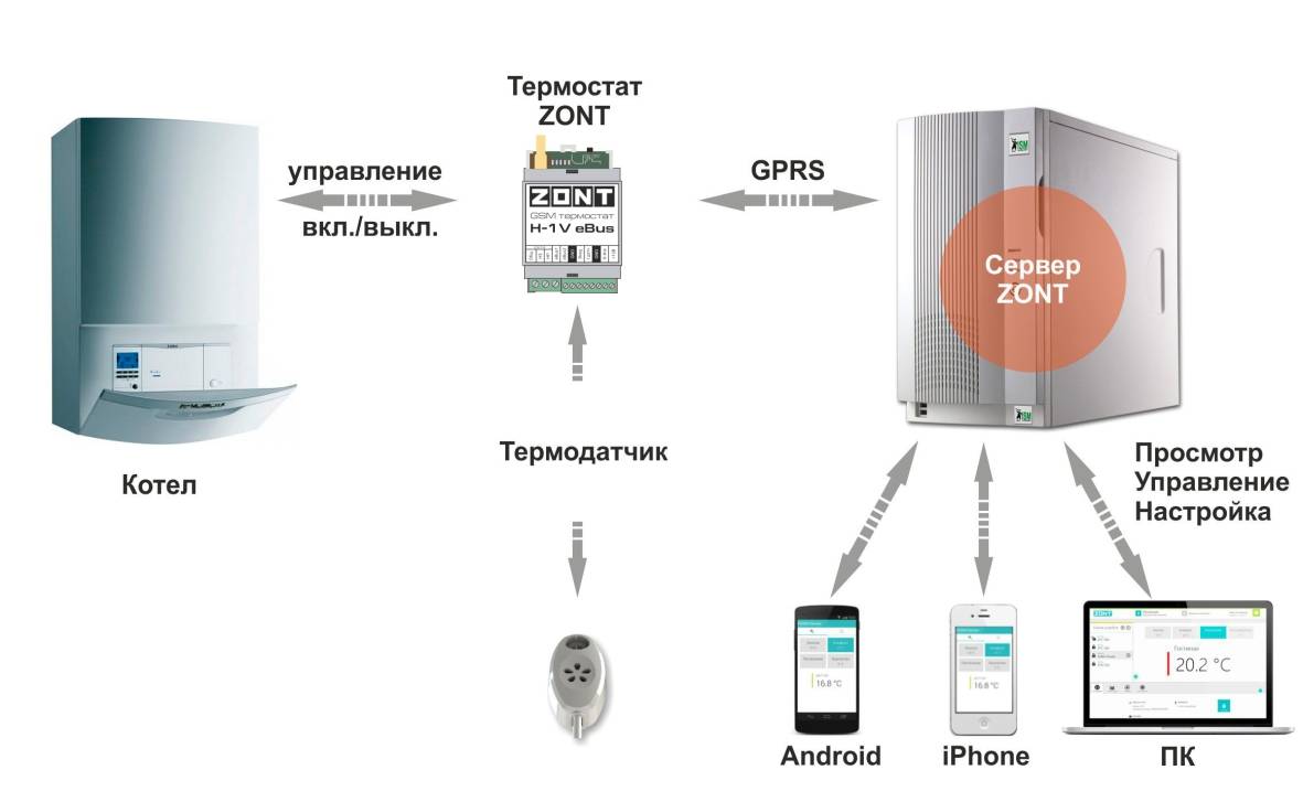 Darauf aufbauend ist eine Regelung der Gas- bzw. Energiezufuhr und des Temperaturzustandes des Kühlmittels zu realisieren. Im Allgemeinen können Sie Geld sparen, indem Sie eine Kesselausrüstung installieren, die mit der oben beschriebenen vergleichbar ist, und nur ein Thermometer zur Messung der Wassertemperatur hinzufügen. Durch die Einstellung eines Algorithmus zur Aufrechterhaltung einer bestimmten Temperatur wird der Eigentümer benachrichtigt, wenn diese stark abfällt - dies bedeutet, dass etwas mit dem Kessel oder der Gas- / Stromversorgung nicht stimmt.