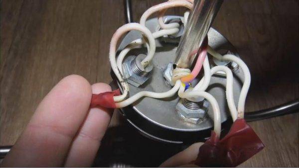 Wie Sie sehen können, gibt es zwei weiße Drähte und einen rosa. Wir haben zwei Drähte, die zur Phase gehen, und ein Draht, in diesem Fall rosa, geht auf „Null“. Dies ist ein gemeinsames Kabel, das zu allen vier Glühbirnen führt. Stellen wir noch sicher, dass dies die Phasendrähte und „Null“ sind. Dazu müssen Sie den Kronleuchter zerlegen.