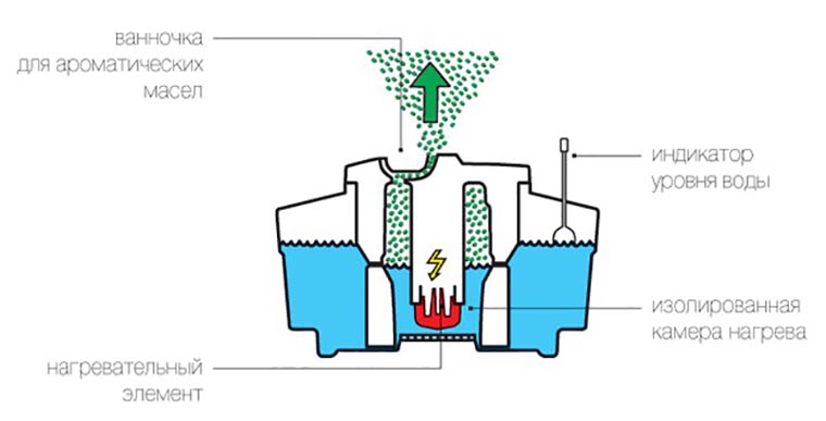 - Aromatisierung von Räumlichkeiten – Wenn Sie ätherische und aromatische Öle in ein spezielles Fach geben, können Sie nicht nur die Luft erfrischen, sondern auch Inhalationen für medizinische Zwecke durchführen.