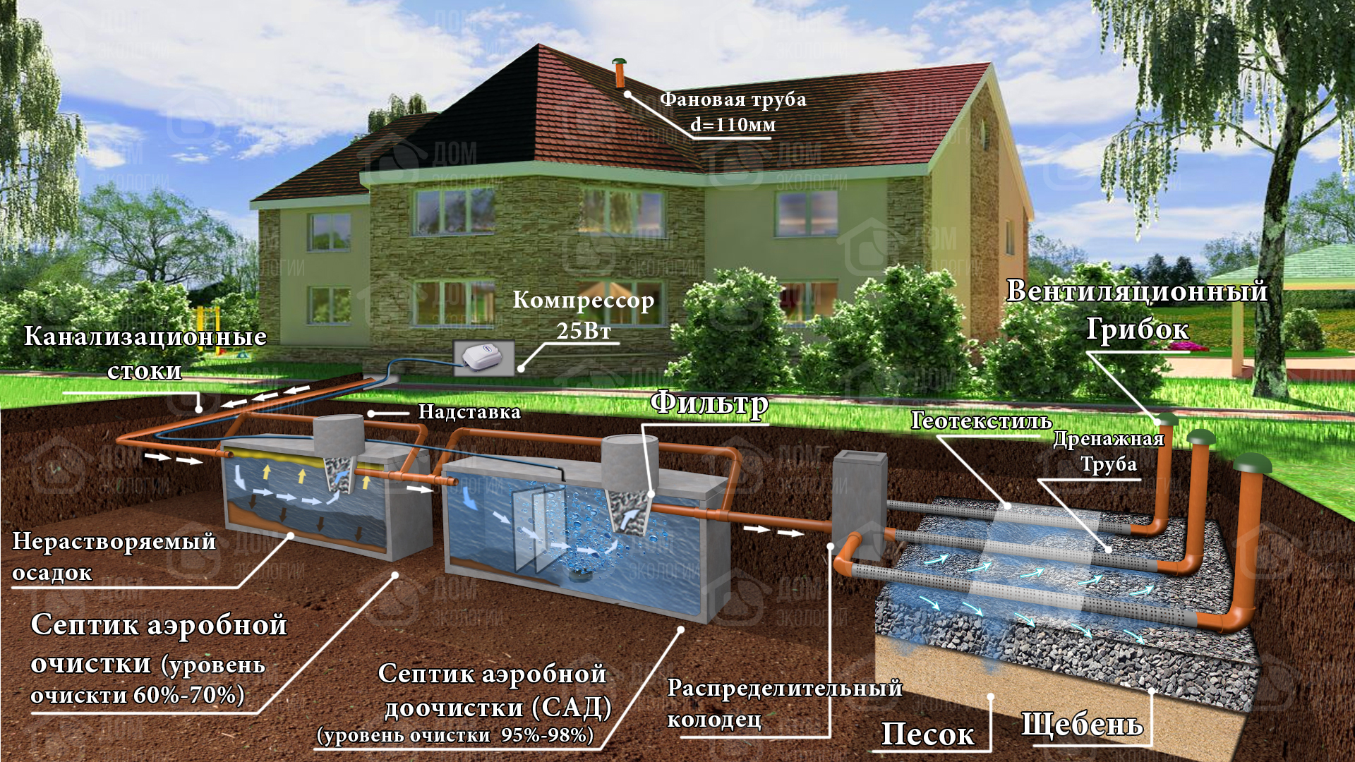 - lokale Kläranlage (VOC). Dies ist eine teure, aber effektive Option, die den Hausmüll vollständig verwerten kann.VOC-Abwasser ist eine komplexe Struktur, die bei ihrer Arbeit spezielle biologische Komponenten verwendet. Das sind Bakterien, die sich von organischem Material ernähren. Ähnliche Methoden werden in herkömmlichen Klärgruben verwendet, aber in VOCs wird diese Technik mit maximaler Effizienz implementiert.
