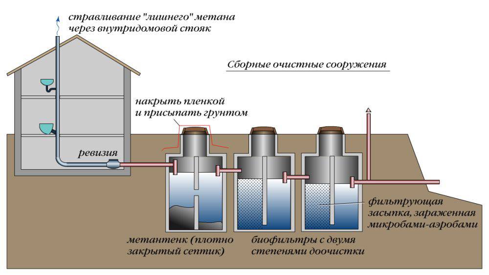 Die Kammern der Klärgrube sind durch Trennwände getrennt. Die Bewegung der Flüssigkeit zwischen ihnen erfolgt durch Überlaufrohre. Ein Abflussrohr ist von der internen Kanalisation des Hauses mit dem ersten Abteil verbunden, und gereinigtes Wasser wird aus der letzten Kammer in den Boden oder halbgereinigtes Wasser zur Bodenreinigung abgelassen.