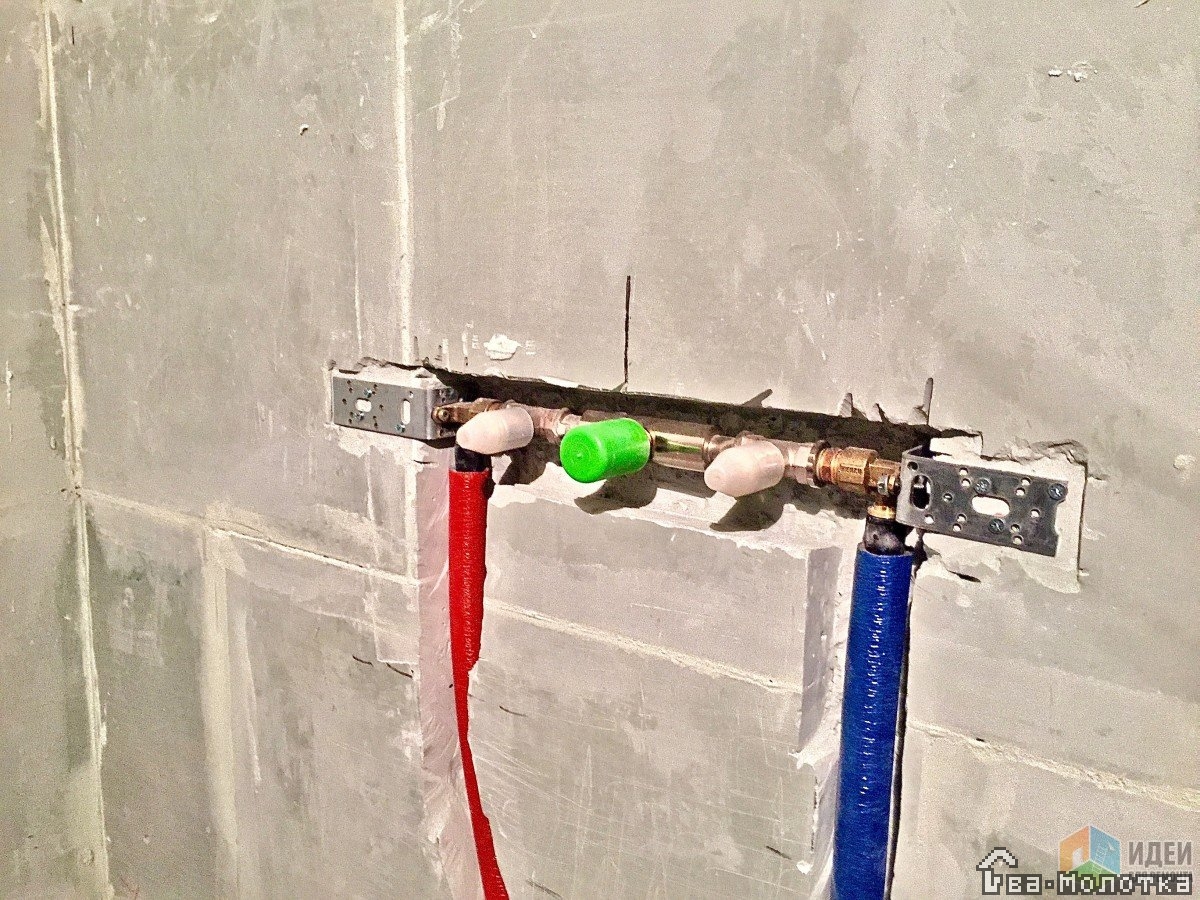 4. Einbau eines Unterputzmischers in eine vorbereitete Dose. Fehlt sie im Set, dient die Nische als Befestigungsort. Schrauben und Klemmen dienen der sicheren Fixierung. (Der weitere Anschluss von Schläuchen erfordert ein genaues Studium der Anleitung).