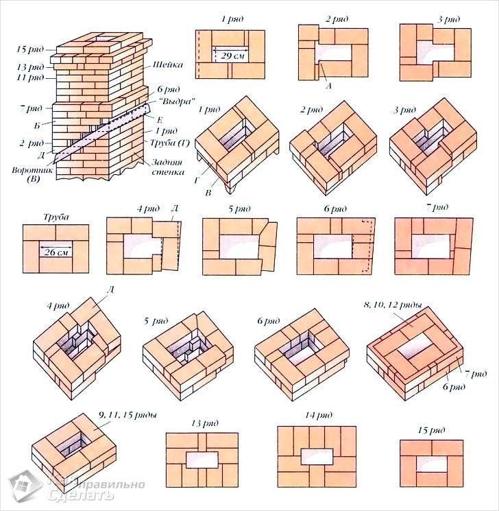 Für Mauerwerk wird ein Ofen verwendet und, wenn die Bestellung (siehe unten) vorliegt, Schamottesteine; der rote arbeiter ist für höchste qualität geeignet - hellrot in der farbe (vollständig geglüht), ohne brandspuren, verzug und quellung. Trockenformstein ist absolut ungeeignet. Das Mauerwerk der Struktur ist rau. Regeln: