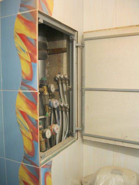 - Wenn alle Rohre und Steigleitungen in einer Ecke des Raums gesammelt werden, ist es besser, eine quadratische Box zu erstellen, hinter der alle Kommunikationen verborgen sind. Vergessen Sie nicht, am Installationsort von Zählern und Ventilen eine Luke anzubringen.