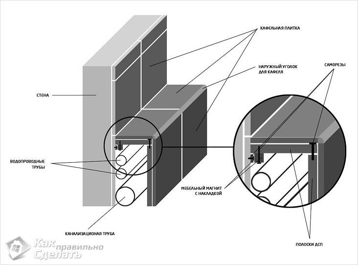 Wenn die Rohre in eine geflieste Wand eingelassen sind, müssen Sie im Notfall die Fliese teilweise demontieren, um ein Leck zu finden. Daher ist der beste Weg, die Rohrleitungen zu schließen, ohne sie in die Wand zu montieren, die Konstruktion von leicht zu errichtenden Strukturen aus zwei Teilen Spanplatten oder Sperrholz, die fest zusammengeschlagen werden.
