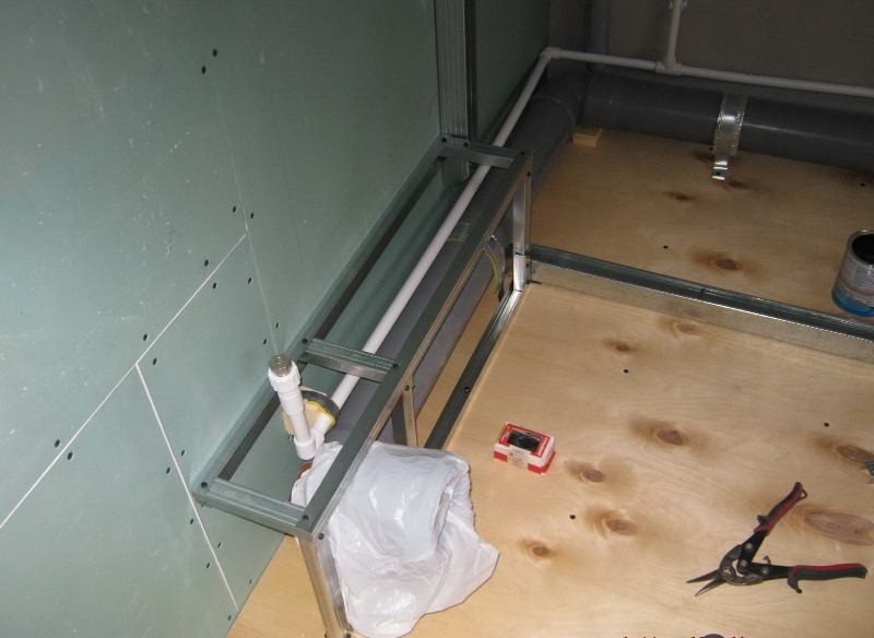 - Es ist ganz einfach, Installationsarbeiten durchzuführen. Zuerst müssen Sie einen Rahmen aus Holz oder Profilen bauen. Dann alles mit Trockenbau ummanteln.