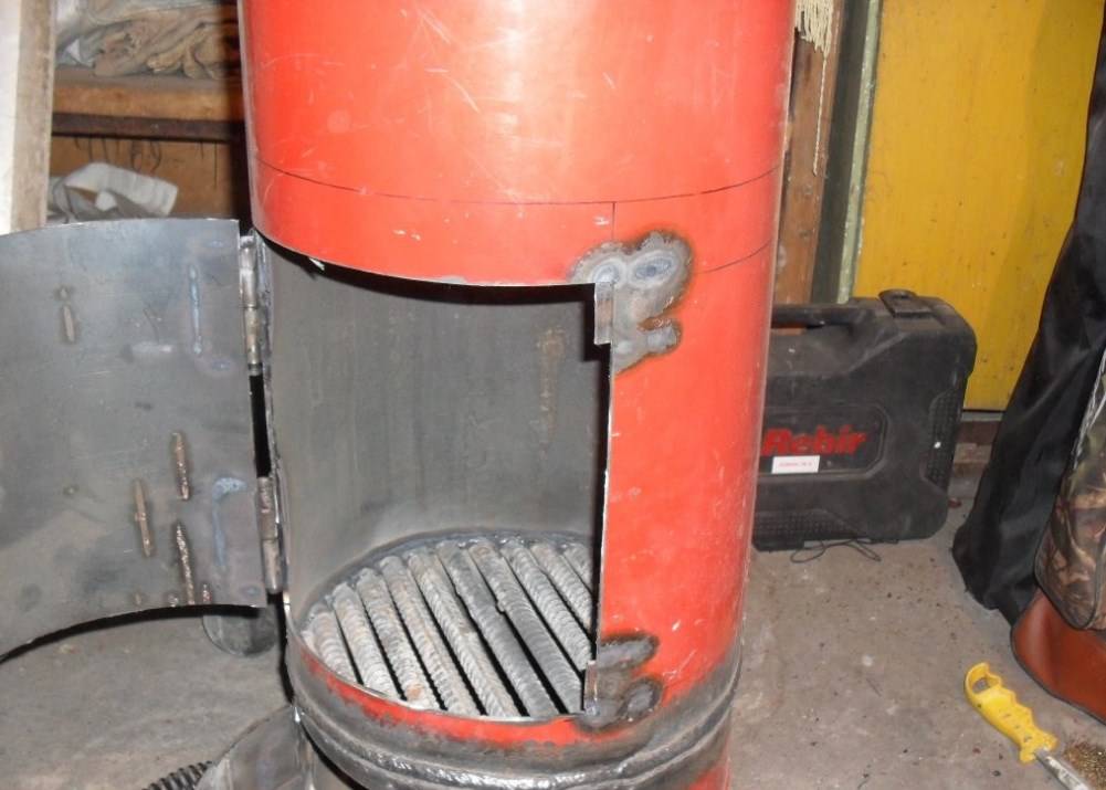 Der Ofen aus einem vertikalen Fass ist nicht auf dem Boden, sondern auf Beinen installiert. Um die Tür zu vervollständigen, müssen Sie die Seite des Tanks schneiden und mit Scharnieren versehen