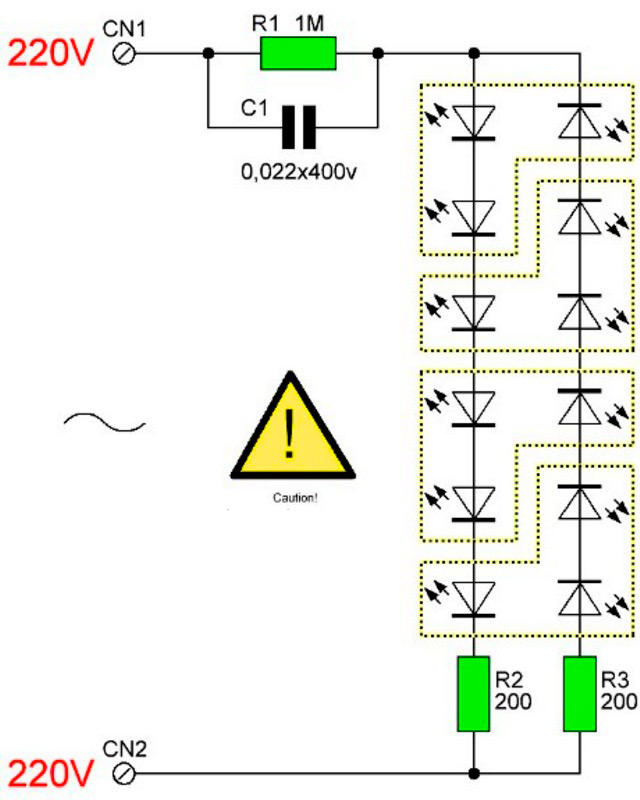 LED 220 V kann leicht aus nicht funktionierenden Lampen hergestellt werden, deren Reparatur oder Restaurierung unpraktisch ist. Ein Streifen aus fünf LEDs wird mit einem Transformator angesteuert. In einer 0,7 uF / 400V-Schaltung reduziert der Polyesterkondensator C1 die Netzspannung. R1 ist ein Entladewiderstand, der die gespeicherte Ladung von C1 absorbiert, wenn der AC-Eingang ausgeschaltet ist.