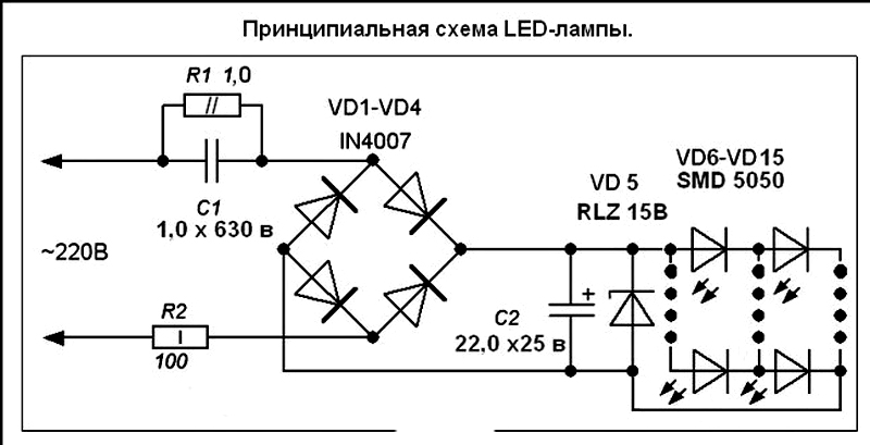 Daher ist die Leuchtdiode notwendigerweise nur über ein Strombegrenzungselement verbunden. Am billigsten und am einfachsten zu montieren sind Schaltungen mit einem Abwärtselement in Form eines Widerstands oder Kondensators.