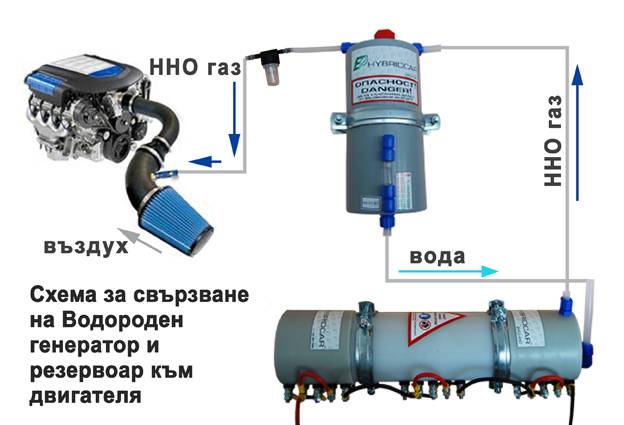 Wasserstoffzellen für Autos enthalten ein Gefäß mit Wasser, das sich unter der Motorhaube befindet. Gewöhnliches Leitungswasser wird in ein Gefäß gegossen und dort ein Teelöffel Katalysator und Soda hinzugefügt. Mit der Batterie verbundene Platten sind im Inneren eingetaucht. Beim Einschalten in der Selbstzündung erzeugt das Design (Wasserstoffgenerator) Gas.