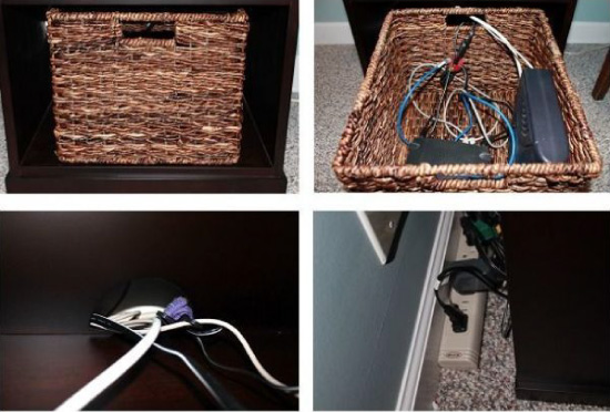 Auf dem Boden liegende Kabel sind nicht nur unästhetisch, sondern auch unsicher. Es ist praktisch, Verlängerungskabel in Boxen zu verstecken, an die viele Geräte angeschlossen sind. Zum Beispiel unter dem Desktop, wo sich ein Desktop-Computer und Peripheriegeräte befinden. Dafür reicht ein gewöhnlicher Schuhkarton. Darin müssen Sie mehrere Löcher für die Drähte bohren und dort ein Verlängerungskabel anbringen. Optional kann die Box mit Dekoelementen verziert oder mit Papier überklebt werden.