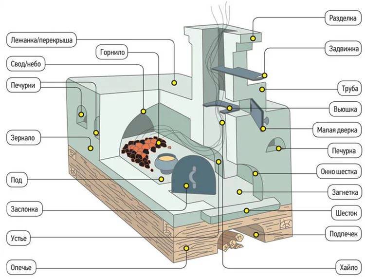 Traditionell wurde ein russischer Ofen mit Ofenbank zum Heizen des Hauses verwendet. Strukturell bestand es aus folgenden Elementen: