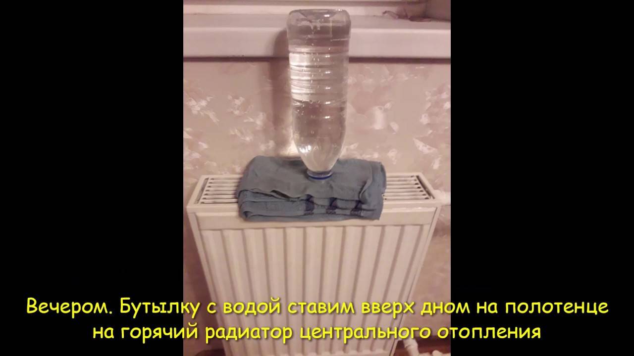 - Von der Seite der Plastikflasche wird ein schmaler Streifen abgeschnitten; Die Flasche wird mit einem starken Faden an beiden Enden in horizontaler Position am Heizrohr befestigt und mit Wasser gefüllt. Wenn sich die warme Luft erwärmt, verdunstet das Wasser und sättigt die Luft.