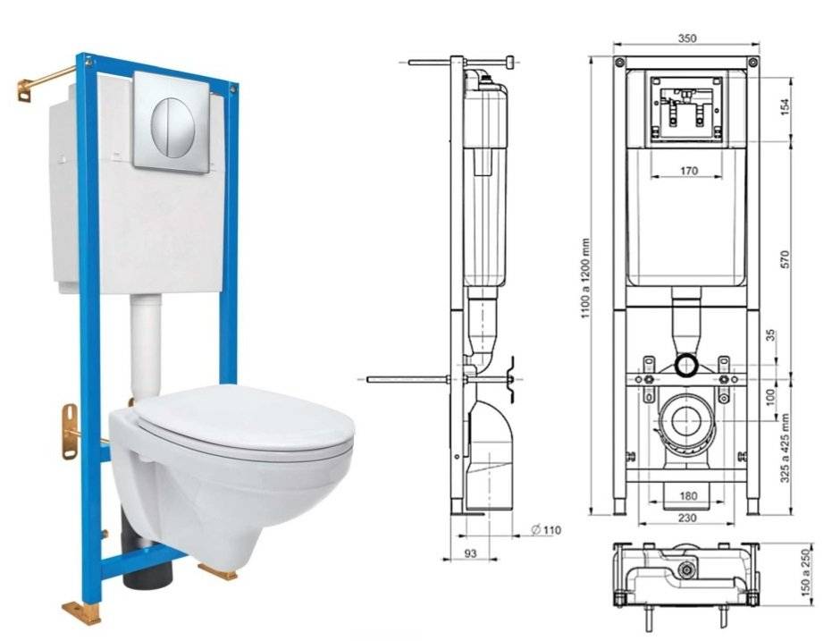 Die Installation ist ein Rahmensystem, das in die Wand eingebaut wird. Dieses System ist mit Teilen einer hängenden Toilettenschüssel, Abwasserrohren, einem Ablauftank, Ablaufknöpfen und anderen Bedienelementen ausgestattet.