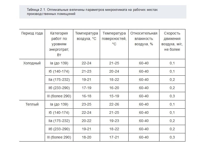 Normalisiert sind auch die Bedingungen für Büroangestellte, deren Arbeit unter Berücksichtigung des Gesamtenergieverbrauchs des Körpers aufgrund der Art der Tätigkeit (bis 139 W) als Arbeitskategorie Ia eingestuft wird (Anlage 1 zu SanPiN, Tabelle P 1.1).