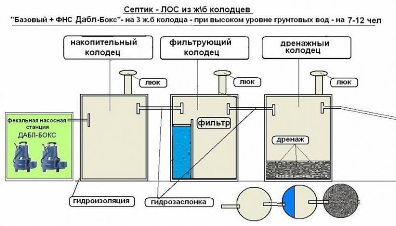 Das Gerät einer Klärgrube aus zwei Tanks: Schema