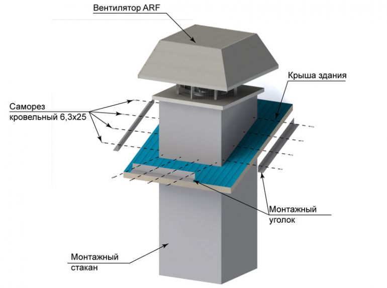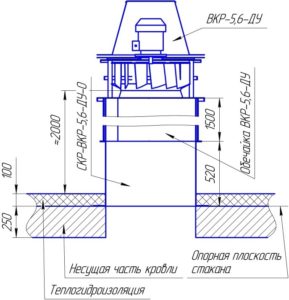 Dachventilatoren können auf verschiedenen Dächern installiert werden. Die Technik der Durchgangseinheit in einem Hartdach ist einfach. In die Decke wird eine technologische Öffnung geschnitten und auf dem Lüftungsschacht wird ein Ziegelfundament für den Ventilator errichtet.