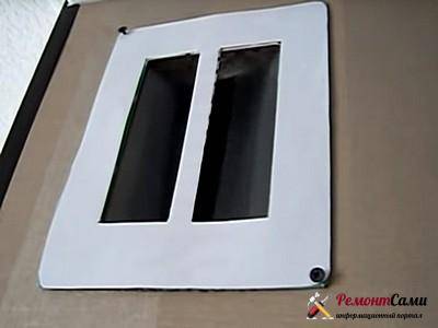 Schritt drei. Der Kartonboden des Ventils ist gekennzeichnet. Zuerst wird die Kontur der Entlüftung auf dem Karton umrissen (horizontal und vertikal sollten die Einkerbungen von den Kanten gleich sein). Als nächstes werden die Ventilfenster skizziert.