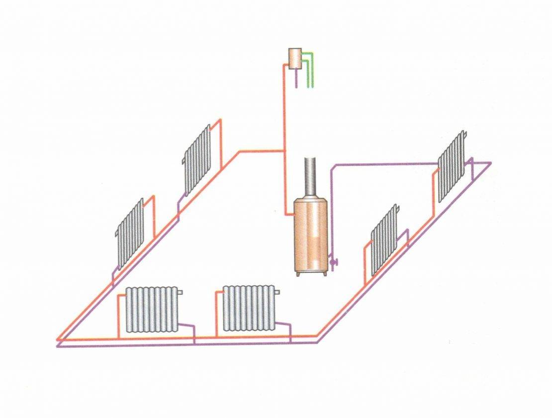 Nachdem das Heizrohr alle Heizelemente durchlaufen hat, kehrt es zum Kessel zurück. Somit ermöglicht dieses Schema, dass das Kühlmittel in einem Teufelskreis entlang des Kreislaufs zirkuliert.