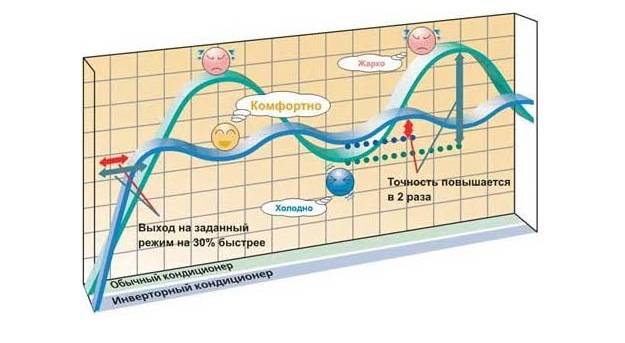 Eine einfache Klimaanlage, wie oben erwähnt, arbeitet mit aller Kraft, und nach Erreichen des entsprechenden Thermometerwertes schaltet sie ab. Der zyklische Prozess der Temperaturanpassung einer einfachen Klimaanlage hat seine eigenen Eigenschaften. Zunächst einmal ist es äußerst inkonsistent, die Temperatur auf dem gewünschten Niveau zu finden. Aufgrund der Beendigung des Splits beginnen sich die Indikatoren zu ändern, und das neu eingeschaltete System muss sie immer wieder einholen. Zweitens treten während des Betriebs der Klimaanlage Stromstöße auf, die sowohl den Betrieb des Geräts selbst als auch den Betrieb des gesamten Stromversorgungssystems beeinträchtigen.