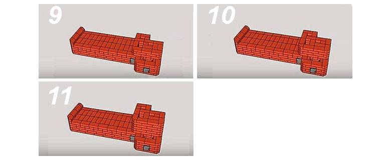 Für die Reihen Nr. 14 und Nr. 15 werden 5 Ziegel ausgegeben, sie schließen den Schornsteinkanal und bilden eine niedrige Mauer zwischen dem Kochfeld und der Ofenbank.