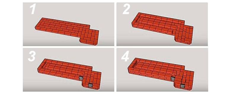 Die erste Reihe bildet die Basis unseres Raketenofens. Es besteht aus 62 Ziegeln, die nach dem in der Abbildung gezeigten Muster verlegt wurden. Die zweite Reihe bildet Kanäle zum Heizen der Couch - sie verlaufen über ihre gesamte Länge. Hier sind gusseiserne Türen montiert, mit Metalldraht befestigt - sie werden zwischen den Reihen gehalten. Die Anzahl der verwendeten Steine - 44 Stück. Die gleiche Menge wird für die dritte Reihe benötigt, wobei die Kontur der zweiten vollständig wiederholt wird. Die vierte Reihe schließt die Kanäle, die das Bett erwärmen, vollständig. Aber hier beginnen sich bereits ein vertikaler Rauchkanal und ein Feuerraum zu bilden - die Reihe umfasst 59 Steine.
