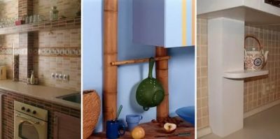 Pfeifen können mit originellen Elementen dekoriert werden, die dem ganzen Raum Schwung verleihen können. Diese Option wird die Küche im Landhaus- oder Provence-Stil erfolgreich ergänzen. Pfeifen sehen ungewöhnlich aus, auf denen das Finish die Textur von Holz - Birke oder Bambus - wiederholt.