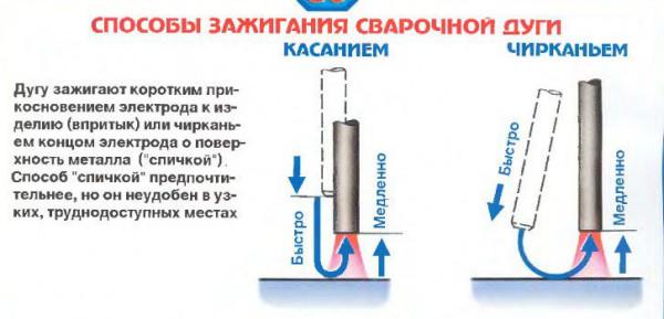 Das Schweißen für Anfänger beinhaltet zunächst die Fähigkeit, einen Lichtbogen zu zünden und danach die Elektrode korrekt vom Teil abzureißen. Das Schweiß-Tutorial empfiehlt zwei Möglichkeiten, den Lichtbogen zu starten. Der erste von ihnen wird durch Berühren und der zweite durch Schlagen ausgeführt.