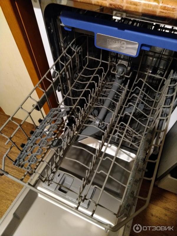 Ich werde gleich sagen, dass das Modell eher durchschnittlich ist, was für seinen Preis ganz natürlich ist. Was sehen wir als Ergebnis? Dies ist ein schmaler Einbau-Geschirrspüler, der für 9 Plätze ausgelegt ist.Sie werden mit diesem Downloadvolumen zufrieden sein, wenn Sie eine kleine oder mittlere Familie haben. Die Praxis zeigt, dass dies ausreicht, um das Auto einmal am Tag laufen zu lassen.