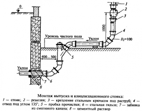 Bei der Verlegung der Rohrleitung ist auf die erforderliche Neigung des Systems zu achten, die den Durchgang von Abwasser durch Schwerkraft gewährleistet. Gemäß den Normen sollten Rohre 3-5 cm pro Meter durchhängen.