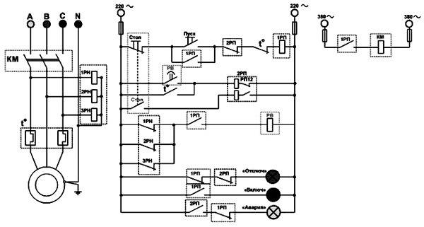 Zur Bezeichnung des Relaisschutzes werden in den Zeichnungen Markierungen von Maschinen, Geräten, Geräten und dem Relais selbst verwendet. Alle Geräte sind in Zuständen ohne Spannung in allen Stromleitungen dargestellt. Je nach Art des Zwecks der Relaisvorrichtung werden drei Arten von Schaltungen verwendet.