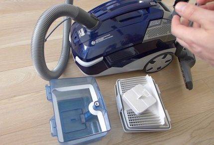 Bei solchen Modellen ist am Körper des Staubsaugers ein spezieller mit Flüssigkeit gefüllter Behälter angebracht, in dem Staub und Schmutz zurückbleiben. Zu den gängigsten gehören Modelle der Genius-Serie.