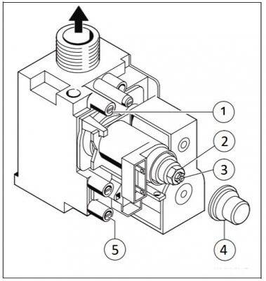 Drei laufen Gaskesselventil im Heizbetrieb. Im Warmwasserbetrieb bewegt sich die Spindel mit dem Ventil nach oben.