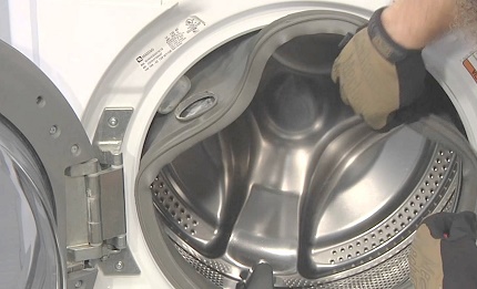 - Nachdem Sie sich Zugang zur Manschette an der Vorderseite des Geräts verschafft haben, entfernen Sie die Befestigungsmanschette und dann die Manschette selbst. Schieben Sie es in die Maschine.
