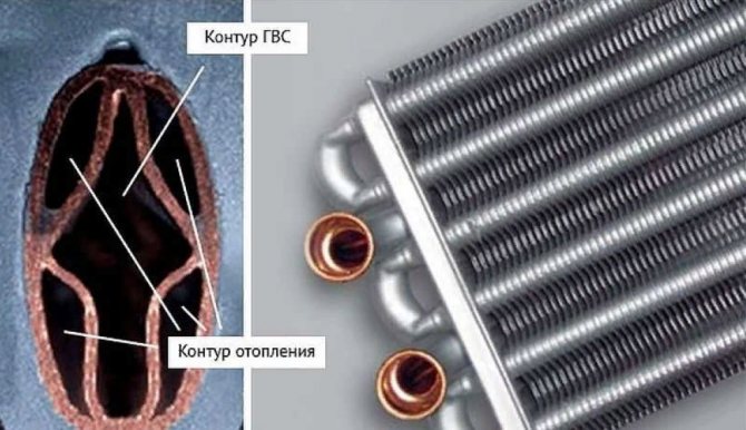 Bithermischer Wärmetauscher eines Zweikreis-Gaskessels. Auf der rechten Seite Rohre für Heizungswasser. Links - Leitungen für Warmwasser, regelmäßiges Entkalken innen und Ruß außen erforderlich.