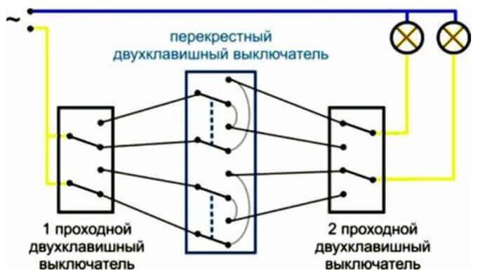 In Ermangelung eines solchen Geräts kann es aus einem Durchgangsgerät mit zwei Schlüsseln hergestellt werden. Eine offene oder geschlossene Kabelverlegung beeinflusst die Anordnung der Schaltungselemente nicht grundsätzlich. Und dieses Gerät schaltet sie bei jedem Tastendruck kreuzweise um.