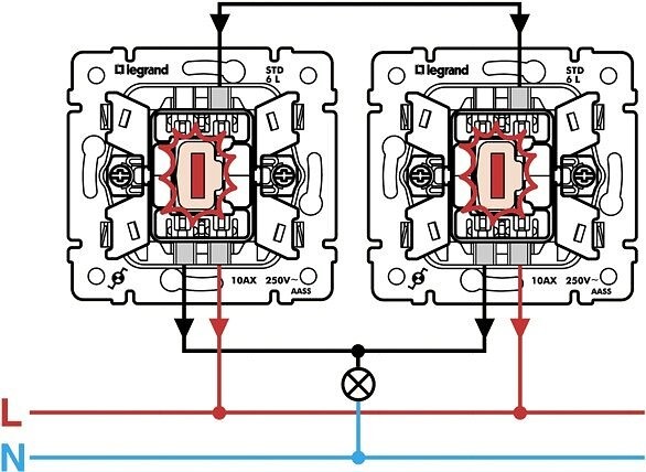 Anwendungsbereich von Pass-Through-Schaltern Die Installation und der Anschluss eines Pass-Through-Schalters ist bei der Steuerung von Beleuchtungssystemen in den folgenden Fällen nützlich: wenn es große Korridore oder Durchgangsräume gibt; bei der Steuerung von Beleuchtungsgeräten am Eingang zum Zimmer und direkt neben dem Bett; bei der Installation von Beleuchtung in großen Industrie- und Industriegebäuden; steuern Sie ggf. die Beleuchtung im Nebenraum; bei Vorhandensein von Treppen, die mehrere Stockwerke verbinden, in den meisten Fällen in Hüttenräumen und so weiter. Der Hauptunterschied zwischen den oben genannten Drähten besteht in der Art der Isolierung und der Art der Leiter. Das schematische Bild zeigt, dass, wenn das Licht eingeschaltet ist, es durch Drücken einer der Tasten ausgeschaltet wird. Die Lichtsteuerung erfolgt mit Hilfe von Schaltern: Für eine Lichtquelle, eine gewöhnliche Glühbirne oder mehrere Lampen gibt es einen Schalter.